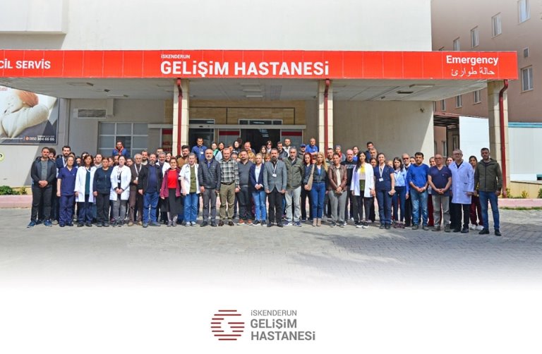 İskenderun Gelişim ve Palmiye Hastanesi Yönetici, doktorları, sağlık personeli, Kahramanmaraş merkezli yıkıcı deprem felaketinden ötürü saygı duruşunda bulundu.